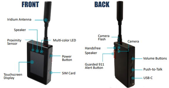 The SHOUT sp is comprised of a touchscreen display, status LED, guarded emergency button, Iridium antenna, and USB-C port. The touchscreen allows easy access to device features, and the USB-C enables charging, firmware updates, and device configuration. The LED displays device status when enabled or may be turned off in a tactical environment.